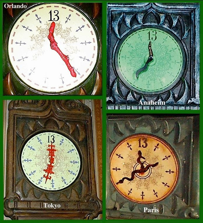 (1) The haunted grandfather clock appears in all of the Mansions (Anaheim, Orlando, Tokyo, and Paris), but each one is slightly different, especially with regard to the hands.